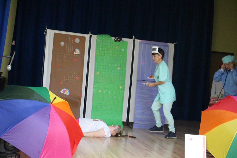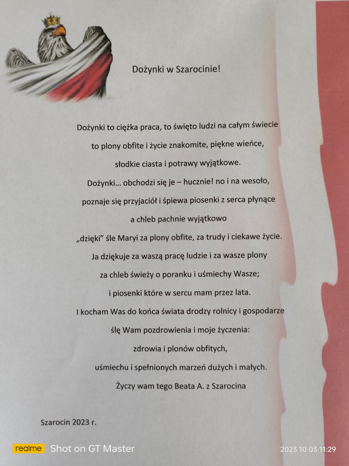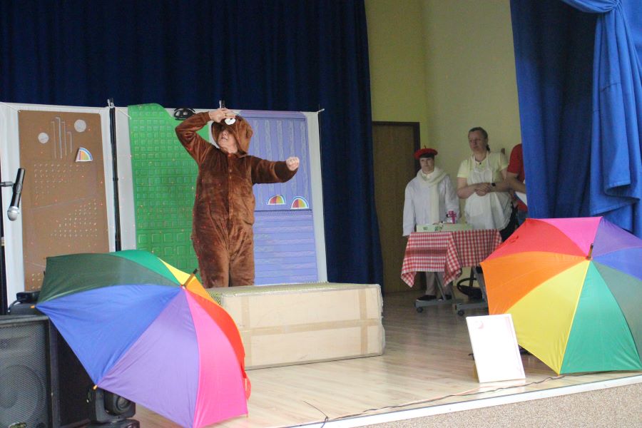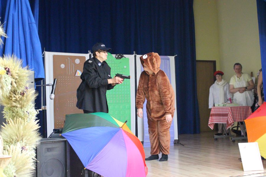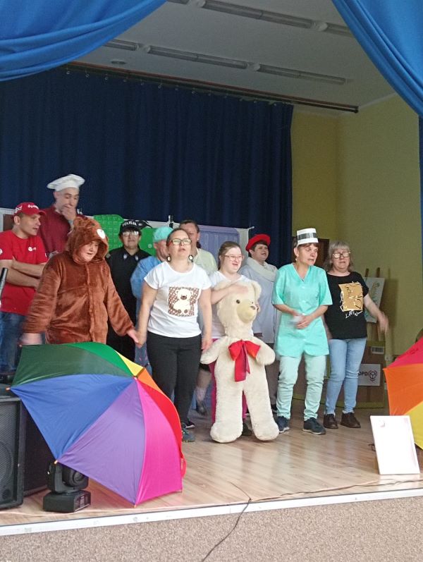 W dniu 30.09.2023 r. nasza grupa teatralna „Pod Parasolem” uczestniczyła w dożynkach sołectwa Szarocin. W odpowiedzi na zaproszenie Pani Sołtys Danuty Kic podczas uroczystości przedstawiliśmy spektakl pod tytułem „Gdzie jest moje miejsce” oraz zaprezentowaliśmy wiersz naszej mieszkanki Beaty Aleksiejuk pt. „Dożynki”. Po swoich występach aktorzy wraz z terapeutami oglądali występy wokalno-muzyczne utalentowanych dzieci ze szkoły z Szarocina oraz brali udział w poczęstunku. W skład grupy teatralnej wchodziło nawet 14 aktorów w zależności od możliwości zdrowotnych. Dziękujemy za zaangażowanie i przykładanie się do odgrywania swoich ról: Ewie, Marcinowi, Grzegorzowi, Grażynie, Ewie, Robertowi, Wiktorii, Faustynie, Anecie, Anicie, Stanisławowi, Ewelinie, Patrycji i Teresie.
