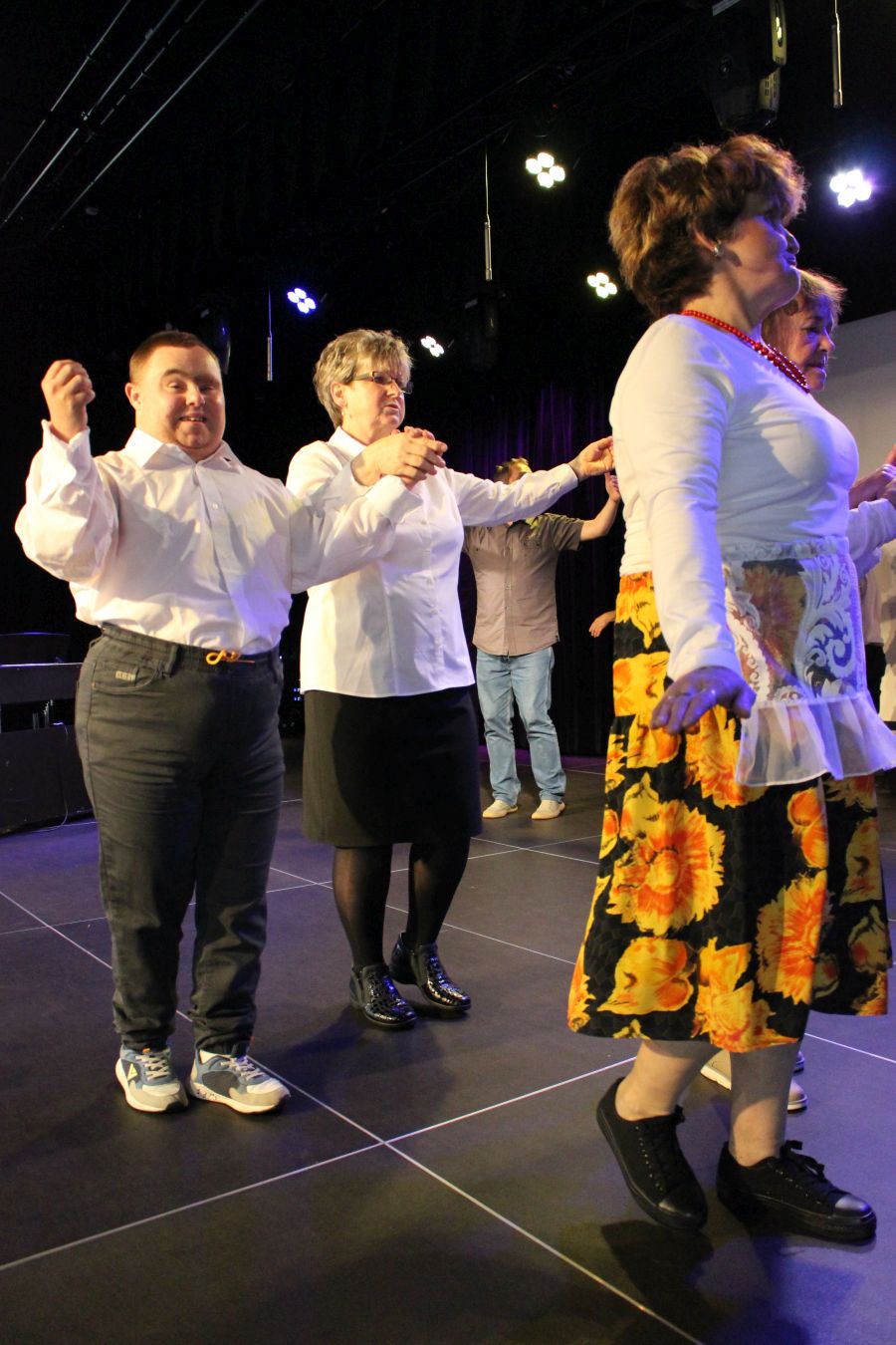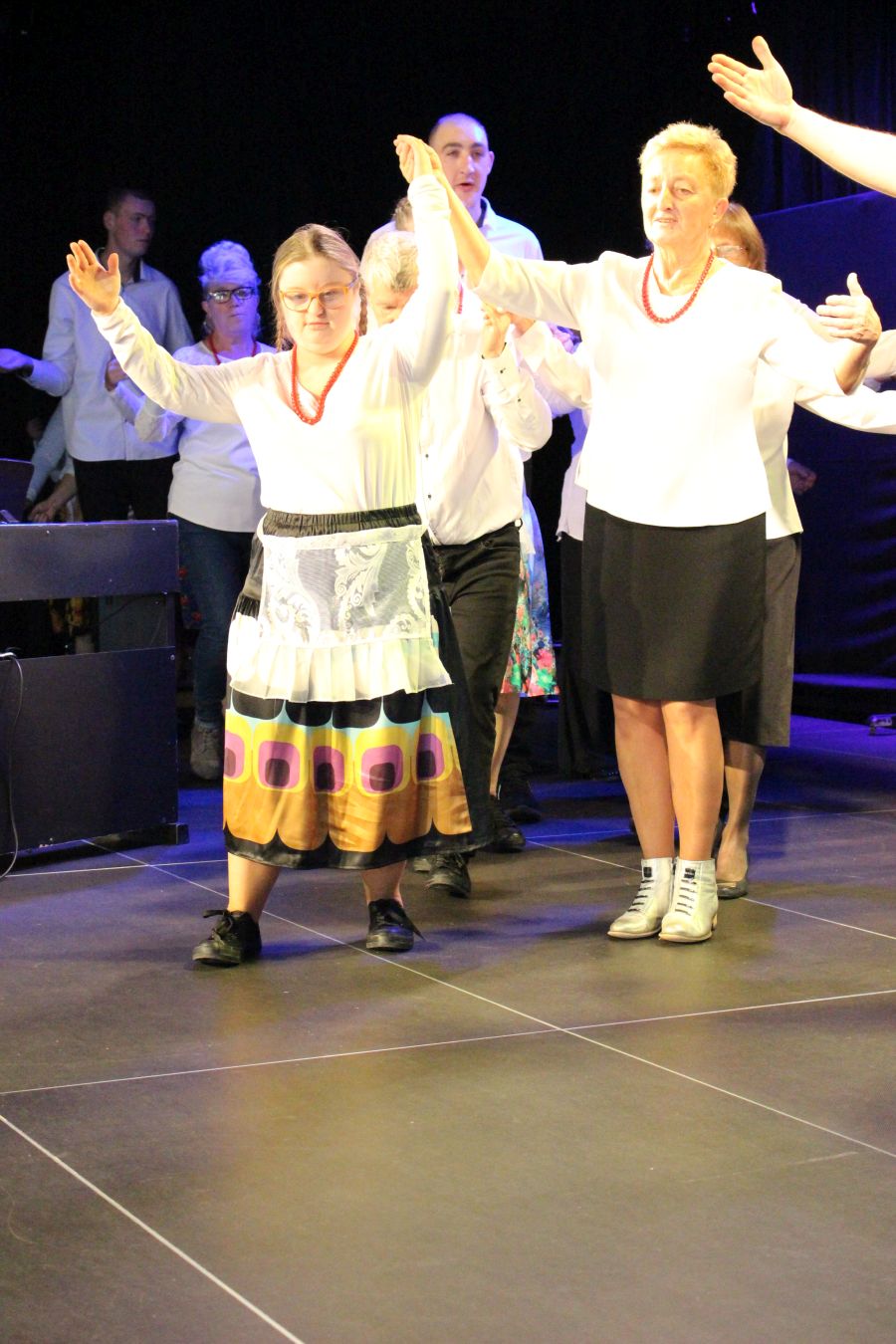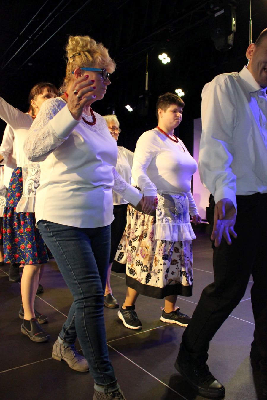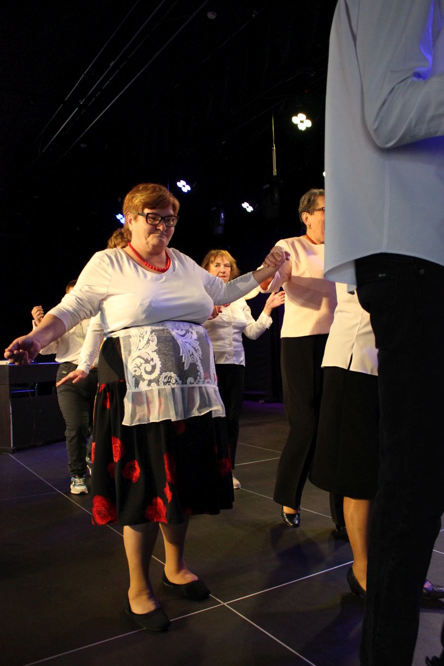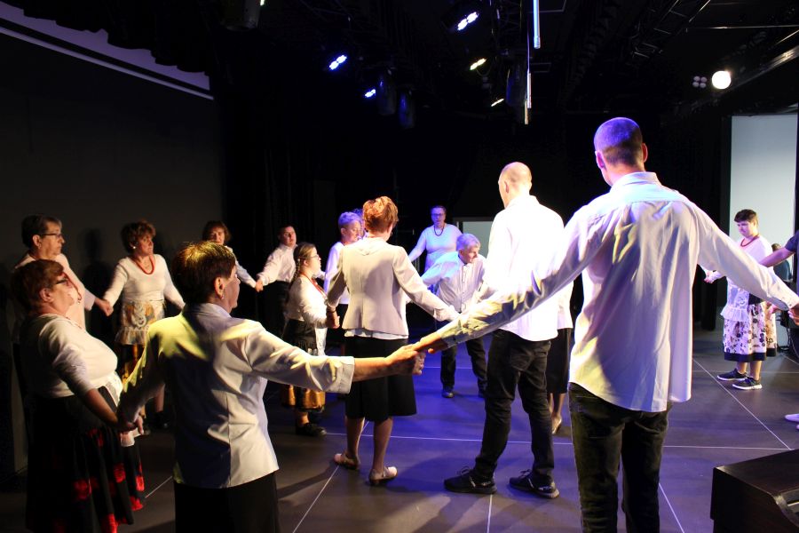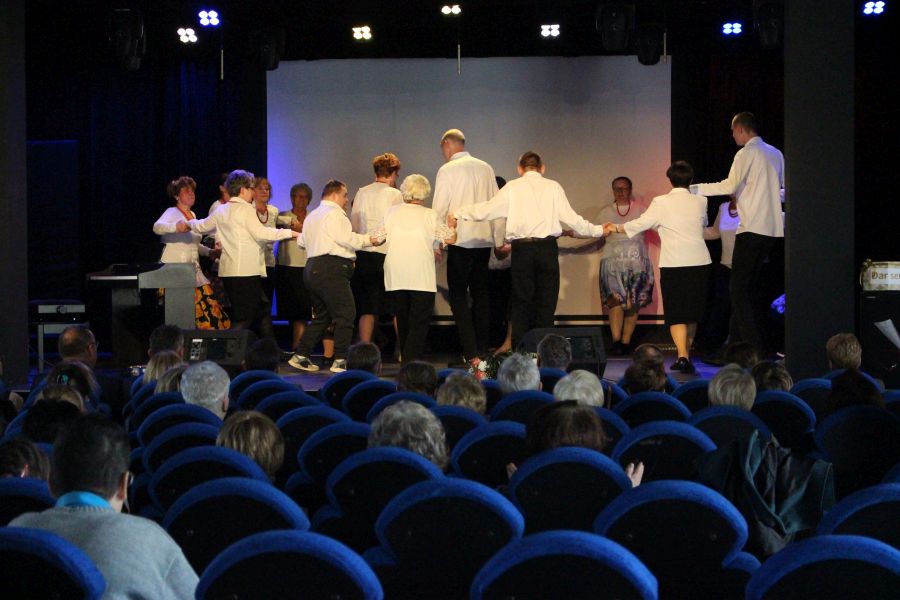 Nasi tancerze pod koniec imprezy zaprezentowali dwa tańce ćwiczone wspólnie ze słuchaczami KUTW już od marca tego roku. Panie i Panowie na scenie w bluzkach zakupionych w ramach projektu oraz w uszytych przez Panie z UTW spódnicach i fartuszkach prezentowali się bardzo profesjonalnie.