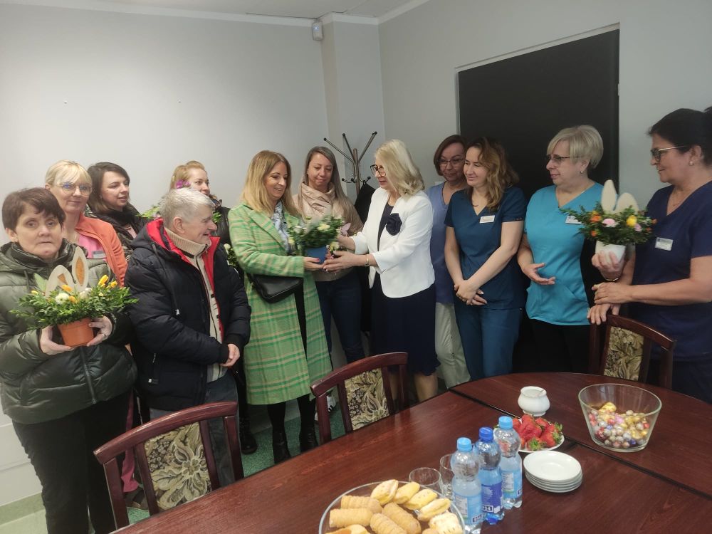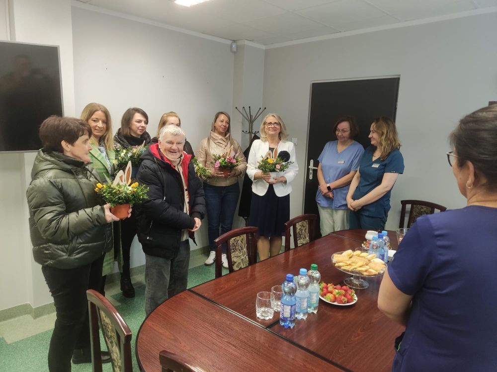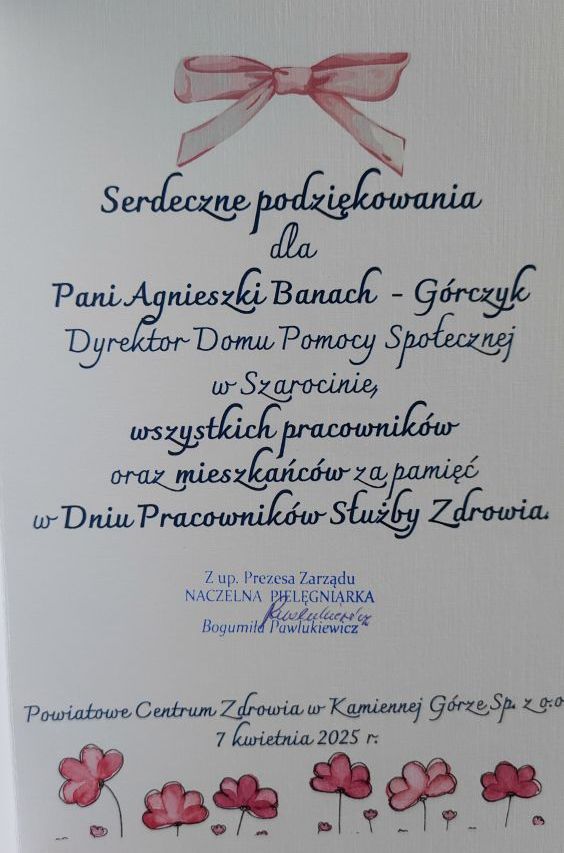 W Dniu Pracowników Służby Zdrowia składamy najserdeczniejsze życzenia zdrowia, wytrwałości i samych słonecznych dni tym, którzy dbają o nasze zdrowie i samopoczucie w placówkach medycznych. Także z tej okazji, Pani Dyrektor Agnieszka Banach-Górczyk wraz z mieszkańcami i pracownikami naszego Domu udała się do Powiatowego Centrum Zdrowia w Kamiennej Górze by złożyć tamtejszym pracownikom najlepsze życzenia i wręczyć piękne stroiki wykonane na terapii zajęciowej.