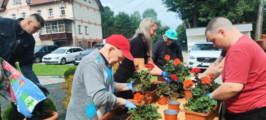 Wczoraj i dzisiaj mieliśmy przyjemność wspólnie posadzić kwiaty do donic na terenie naszego Domu w Szarocinie! To nie tylko piękna dekoracja, ale także świetna okazja do kontaktu z przyrodą, który ma pozytywny wpływ na nasze samopoczucie. Mieszkańcy chętnie zaangażowali się w sadzenie, ciesząc się chwilą spokoju i radości z obcowania z naturą. Takie aktywności pomagają nam zrelaksować się, poprawiają nastrój i dodają energii na kolejne dni. To małe, ale ważne chwile, które przypominają nam, jak wielką moc ma kontakt z przyrodą! Zostało nam kilka wolnych donic, które czekają na kolejne partie sadzonek.