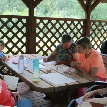 Ponieważ pogoda nadal nie chce się zdecydować, postanowiliśmy wybrać bezpieczną formę spędzania czasu na świeżym powietrzu. W przyjemnej atmosferze, w otoczeniu zieleni i naturalnego śpiewu ptaków, kontynuujemy zajęcia plastyczne w jednej z altanek
